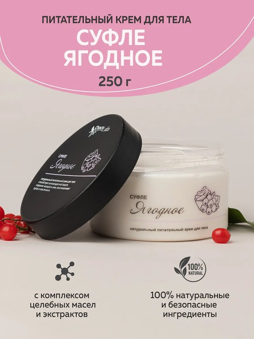 Натуральный питательный крем СУФЛЕ ЯГОДНОЕ для тела способствует антиоксидантной защите, сохраняет молодость кожи, восстанавливает тургор и эластичность.