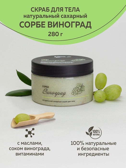 СОРБЕ ВИНОГРАД - сахарный ароматный крем-скраб с маслами, экстрактами и витаминами, натуральное средство для очищения, питания и восстановления кожи, устранения сухости и шелушения.