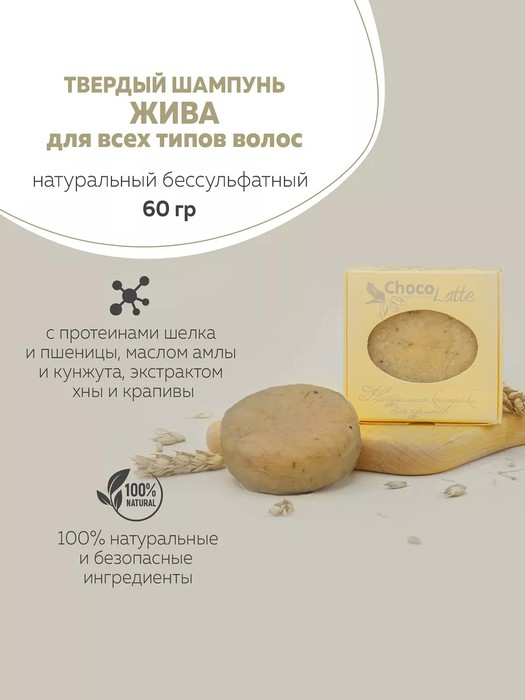 Твердый шампунь «ЖИВА» содержит только мягкие анионные ПАВ, не раздражающие кожу, в том числе чувствительную, в тоже время великолепно очищающие кожу голову и волосы от грязи, бактерий и кожного жира, при этом не пересушивая волосы. Средство произведено по технологии «water free» без консервантов, ведь твёрдый безводный формат не требует консервации. В состав твердого шампуня ТМ ChocoLatte не входят искусственные красители и ароматизаторы.