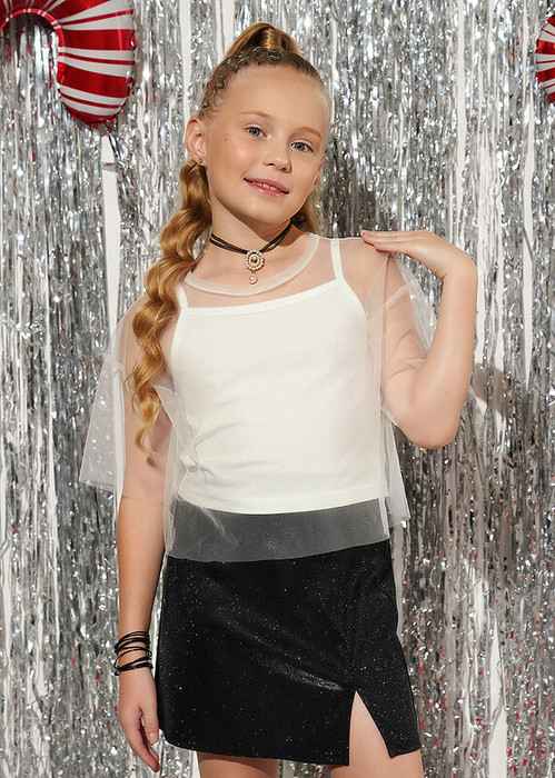Двухслойная футболка для девочки. Рукава и верхний слой выполнены из сетки, нижний слой - из хлопкового трикотажа с эластаном. Свободная посадка. Стильная модель для праздника.