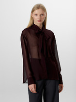Блузка свободного кроя из текстильного полотна штапель без рукавов. Перед и спинка двойные, внизу нашивка дерево. По спинке средний шов, вверху щель с завязками из окантовки.