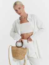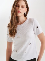 Джемпер свободного кроя из фактурного трикотажного полотна джерси. Спущенная линия плеча, короткий рукав, по низу рукава вышивка. V-образная горловина с широкой обтачкой, внизу изделия нашивка дерево. По спинке средний шов.