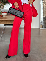 Брюки прямые из плотного трикотажного полотна. По талии притачной пояс с застежкой на пуговицу, по спинке пояс на резинке. По переду карманы в листочку с декоративной тесьмой.