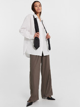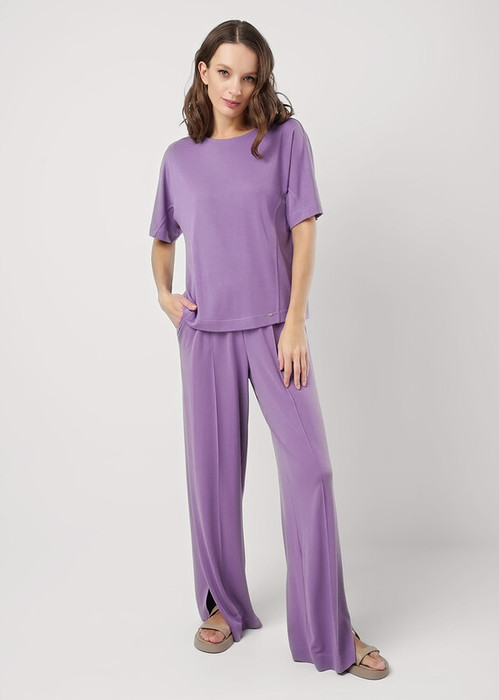 Брюки широкие из вискозного трикотажного полотна пике. По талии притачной пояс с внутренней резинкой. Боковые карманы с отрезным бочком. По переду и спинке защипы, внизу боковые разрезы.