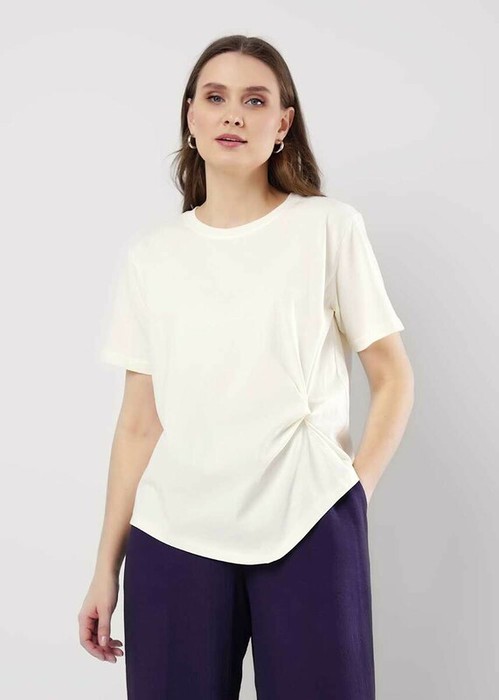 Джемпер прямого силуэта из хлопкового трикотажного полотна. Короткий втачной рукав. Округлая горловина с обтачкой. По переду декоративный узел. Фигурный низ изделия. На спинке принт вспенка.