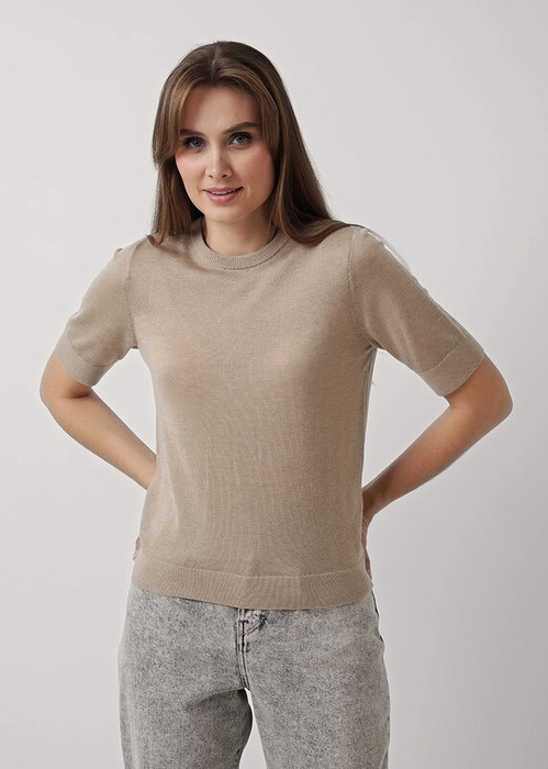 Вязаный джемпер прямого силуэта из вискозной пряжи с добавлением нейлона. Короткий втачной рукав. Основное переплетение гладь. Округлая горловина с бейкой. По низу изделия и рукавов манжеты.