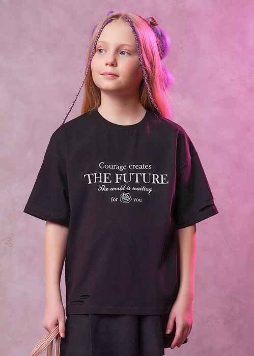Стильная футболка с прорезями из хлопка с эластаном прекрасно дополнит твой гардероб. Модель кроя оверсайз дополнена эластичной горловиной и стильным принтом.Создавай стильные яркие образы,сочетая модель с юбкой или брюками из новой коллекции