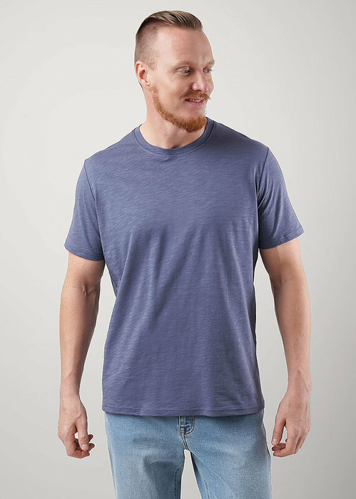 Футболка мужская с округлой горловиной и коротким втачным рукавом из фактурного полотна ""флам"". Изделие дополнено имиджевым принтом в цвет полотна. Данная модель прекрасно комбинируется с джинсами или шортами благодаря своей универсальности.