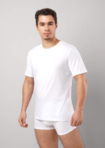 Футболка мужская из трикотажного полотна, с круглым вырезом горловины и коротким рукавом. Материал эластичен, не сковывает движений, благодаря хлопку в составе обладает дышащими свойствами.