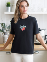 Футболка классического кроя из плотного хлопкового трикотажного полотна. Короткий втачной рукав. Округлая горловина с обтачкой из рибаны. По переду принт с фольгой