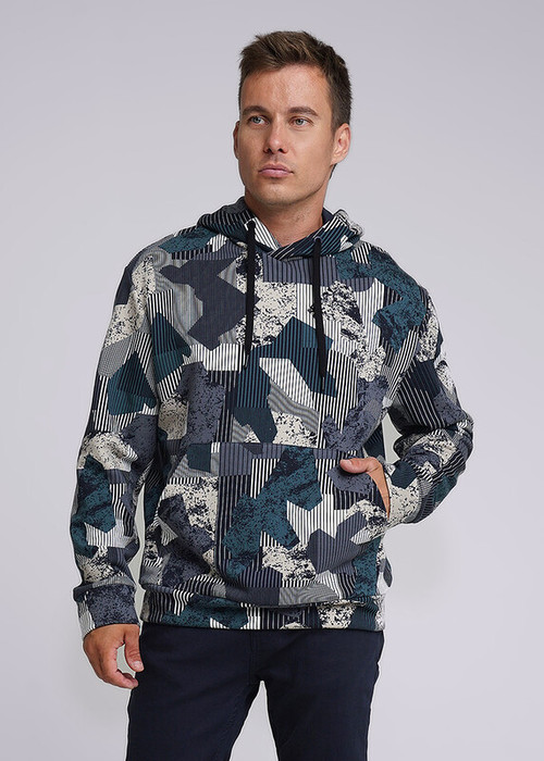 Молодежное худи из футера с капюшоном и регулируемым шнуром, с удобным спущенным рукавом и карманом ""кенгуру"". Модель интересна благодаря абстрактной набивке. Составит отличный комплект с брюками.