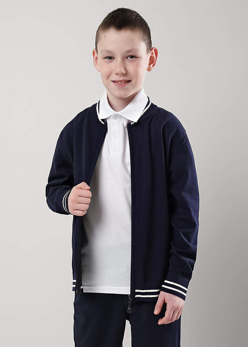 Базовый бомбер из хлопковой пряжи для мальчика. Застежка- молния, по низу рукавов и изделия эластичная вязка, украшенная декоративными полосками.