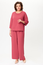 Комплект из текстильного полотна штапель-креп. Блузка свободного кроя. Втачной рукав. Отложной воротник спереди планка на пуговицах,накладной карман.Боковые разрезы.Брюки широкие. По талии пояс на резинке,с завязками. Боковые карманы в отрезном бочке.