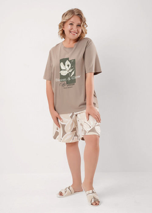 Набор одежды из хлопкового трикотажного полотна с добавлением модала. Футболка прямого кроя, короткий втачной рукав. Округлая горловина с обтачкой. Спереди принт. Боковые разрезы. Шорты с поясом на внутренней резинке. Боковые карманы с отрезным бочком.
