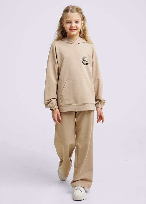 Комплект из футера - идеальная база для активного отдыха! Худи среднего объёма, низ рукава на резинке. Спереди минималистичный принт. Широкие брюки среднего объёма, эластичныйс пояс на резинке.