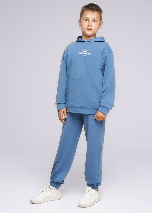 Комплект из футера - идеальная база для активного отдыха! Худи среднего объёма. Спереди контрастный принт. Брюки среднего объёма с карманами в боковом шве, пояс и низ на резинке.