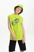 Летняя майка из хлопка. Горловина и проймы окантованы эластичным полотном. По переду игровой принт.