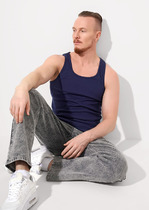 Майка классической посадки, без боковых швов, круглый вырез горловины средней глубины. Срезы пройм и горловины обработаны окантовкой. На детали спинки с изнаночной стороны имиджевая тампонная печать. Плотность:185-190 гр/м2