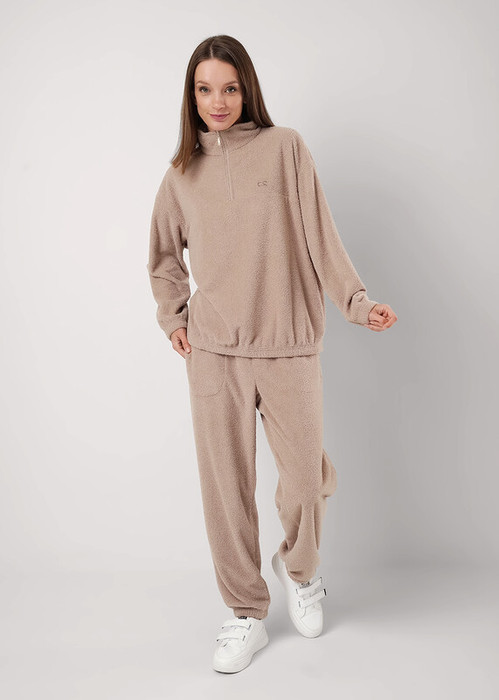 Женский костюм из велсофта ""барашек"", состоящий из джемпера и брюк. Джемпер с воротником стойка на молнии, на детали переда фирменная вышивка. По низу изделия и рукавов резинка. Брюки с боковыми карманами, по низу брюк резинка.