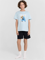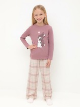 Комплект хлопковой пижамы из футболки и брюк. Футболка свободного кроя со спущенным плечом, спереди украшенная милым тематическим принтом. Брюки среднего объема, эластичный пояс обеспечит комфорт и идеальную посадку. По низу брюк эластичные манжеты.