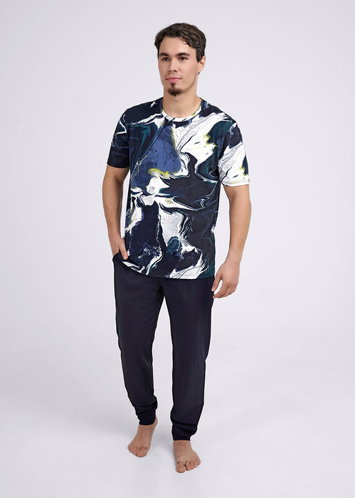 Комплект мужской состоящий из футболки и брюк. Футболка из трикотажного полотна с авторской набивкой и коротким рукавом. Брюки из трикотажного полотна на широком поясе с резинкой и регулируемым шнуром, по бокам удобные карманы.