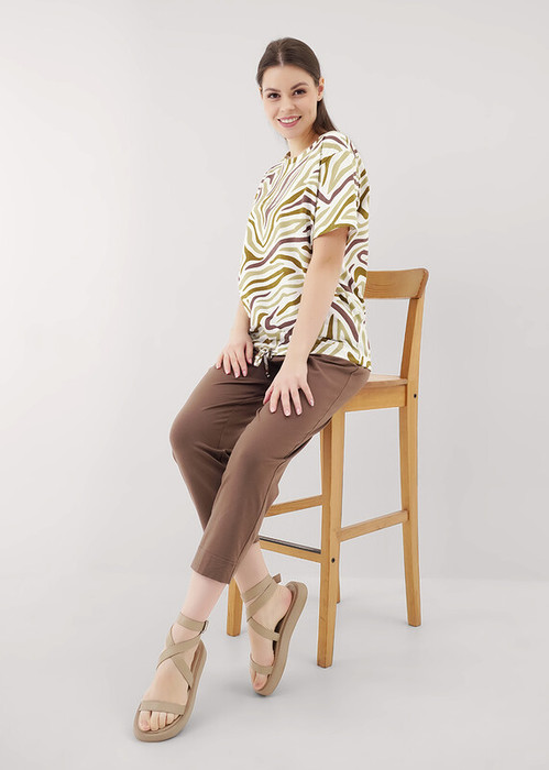 Набор одежды из хлопкового трикотажного полотна.Джемпер прямого силуэта,по талии кулиса со шнуром из окантовки. Втачной рукав.Горловина с обтачкой.Спереди термонашивка.Брюки длиной 7/8 с поясом на резинке.Боковые карманы с отрезным бочком,нашивка кокос.,