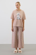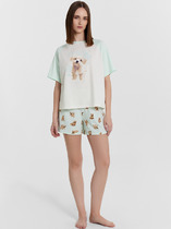 Пижама для дома из хлопкового трикотажного полотна. Майка прямого силуэта, на узких бретелях. По горловине и пройме окантовка. Короткие шорты свободного кроя, цельнокроеный пояс на внутренней резинке.