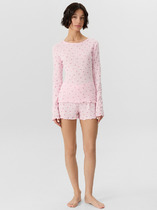 Пижама для дома из трикотажного полотна кашкорсе лапша. Майка укороченная. Узкая бретель. Округлый вырез горловины. По горловине и пройме окантовка.Спереди нашивка. По низу внутренняя резинка. Шорты прямого кроя, пояс на внутренней резинке, нашивка.