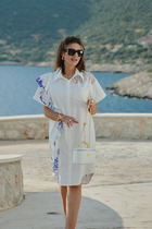 Платье из текстильного полотна штапель-креп, длиной ниже колена. Лиф переда двойной со сборкой. Рукав короткий, присборен на резинку. По переду средний шов. По спинке боковые рельефы и рез по талии со сборкой. Молния в боковом шве.
