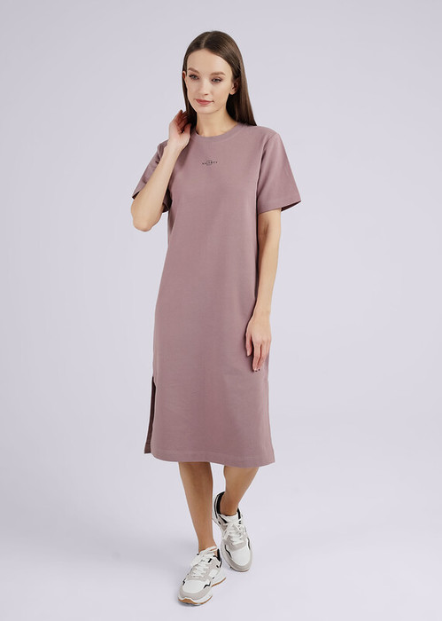 Платье-футболка прямого силуэта с втачным рукавом, платье длиной ниже колена, в боковых швах выполнены разрезы, горловина обработана обтачкой