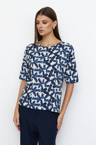 Блузка из текстильного полотна поплин, прямого силуэта на пуговицах с отложным воротником. По борту планка с пуговицами, по спинке кокетка. Длинный рукав со спущенной линией плеча. По низу рукава притачной манжет с пуговицей. Низ изделия фигурный.