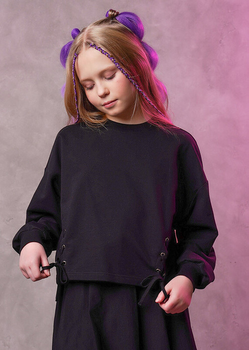 Трендовый свитшот станет модной новинкой в твоем гардеробе! Стильное дополнение - разрезы на шуровке по переду. Сочетай свитшот с брюками или юбкой из новой коллекции и создавай яркие неповторимые образы на каждый день!