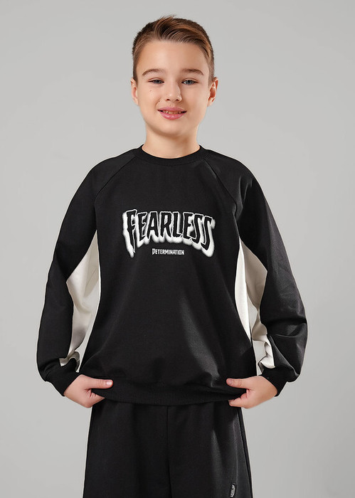Трендовый свитшот из футера для подростка. Комфортная посадка, эластичная горловина. Модель дополнена фигурными контрастными вставками. Спереди стильный принт. Сочетай свитшот с брюками из новой коллекции и создавай крутые образы!