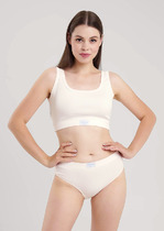Бюстгальтер спортивный без каркасов выполнен из микрофибры. Тонкие формованные чашки. Бретели регулируемые. Впереди вставки из сетки.