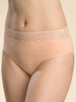 Трусы бикини, изготовлены из однотонного эластичного полиамидного полотна. Края изделия обработаны лазером, благодаря чему нити не распускаются. Модель не заметна под облегающей одеждой, прекрасно держит форму, но при этом отличается эластичностью.