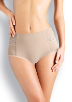 Трусы-бикини женские из эластичного хлопкового полотна. По бокам и спинке кружево. Обработка краев по талии - ажурная резинка с фестоном. Спереди бант.