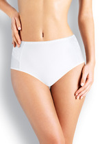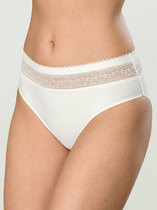 Бразилиана. Комбинированная модель с кружевной вставкой по верху переда и кружевной спинкой со средним швом. По поясу и ножке со стороны переда обработка резинкой с фестоном. На детали переда - небольшой атласный бант.