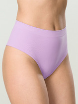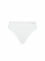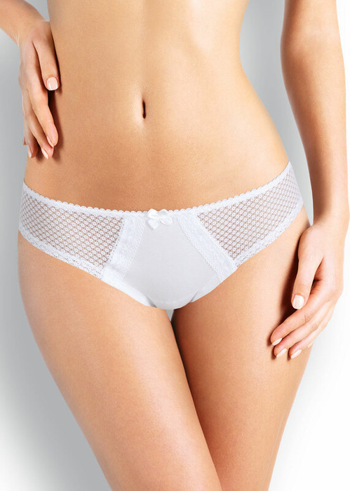 Бразилиано. Комбинированная модель: перед - однотонное хлопковое полотно, спинка и отрезной бочок - кружево. По талии - резинка с фестоном. В центре на детали переда расположен небольшой атласный бант. Декорированы симметричными элементами из кружевной тесьмы,расположенными по линии реза