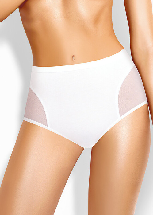Трусы макси женские из эластичного хлопкового полотна. Обработка краев по талии жаккардовая резинка, по ноге - полуокантовка. По переду боковые вставки из сетки, швы застилом.