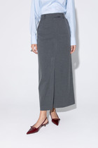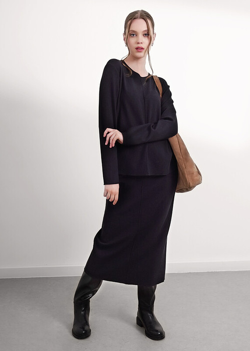 Юбка миди из трикотажного полотна силаник, прямого кроя. По талии цельнокроенный пояс с внутренней резинкой. По переду вертикальный защип, по спинке средний шов внизу разрез. По низу изделия мелкий оверлок.