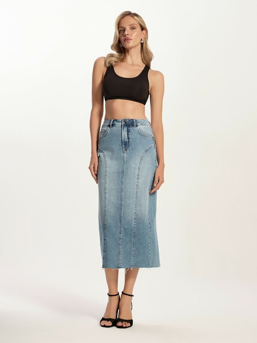 Джинсовая юбка-midi с дугообразными вытачками прекрасно подчеркнёт фигуру и поможет создать лаконичный и стильный образ на каждый день.