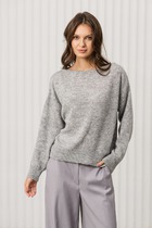 Джемпер женский из трикотажного полотна, комбинированный. Рукав длинный. Спинка выполнена из отделочного полотна. Горловина круглая, по низу джемпера и низу рукавов пришиты манжеты. На уровне груди, с левой стороны прикреплена брошь.