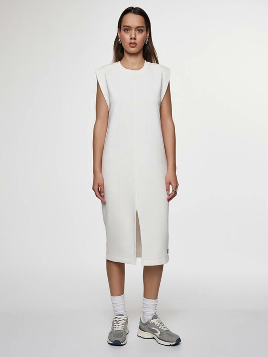 Платье из футера со спущенной линией плеч и разрезом станет основой для множества расслабленных базовых образов, а также может быть стилизовано для умеренно деловых и вечерних аутфитов.