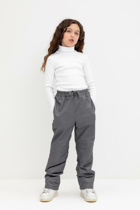 Ветровочные брюки из мембранной, фактурной ткани с дополнительной тефлоновой обработкой. Данный вид обработки предохраняет изделие от загрязнения и лучше отводит влагу. Подклад из 100%  полиэстера - флиса. Область коленей дополнительно усилена деталями из основной ткани. В поясе предусмотрен шнурок для регулировки ширины изделия. Во всех изделиях верхнего ассортимента для безопасности ребенка предусмотрены светоотражающие элементы.