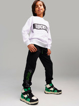 Свободные брюки для мальчика из петельчатого футера трехнитки. Эластичный пояс на резинке регулируется по ширине с помощью шнурка, внизу эластичные манжеты.