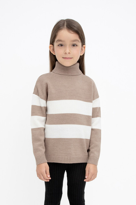 Вязаный джемпер для девочки из мягкой полушерстяной пряжи. Высокий воротник с отворотом хорошо защищает от холода. Длинные рукава с манжетами. Внизу эластичный пояс. Изделие сохраняет форму и стойкий цвет после многочисленных стирок.
