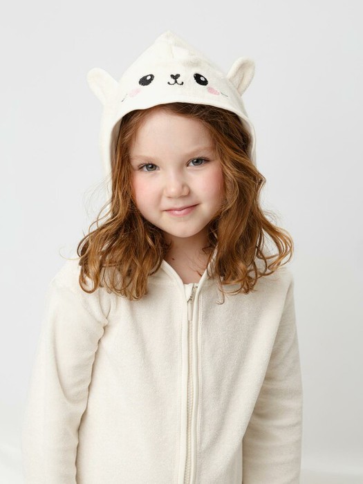 Халат на молнии с капюшоном. Изготовлен из мягкого махрового полотна, произведённого из натурального хлопка. В капюшоне подклад из высококачественного гладкого трикотажа супрем. Изделие украшено вышивкой и декоративными ушками. Края обработаны эластичным кантом. Все трикотажные полотна производятся в соответствии с нормами швейцарского сертификата ЭкоТекс.