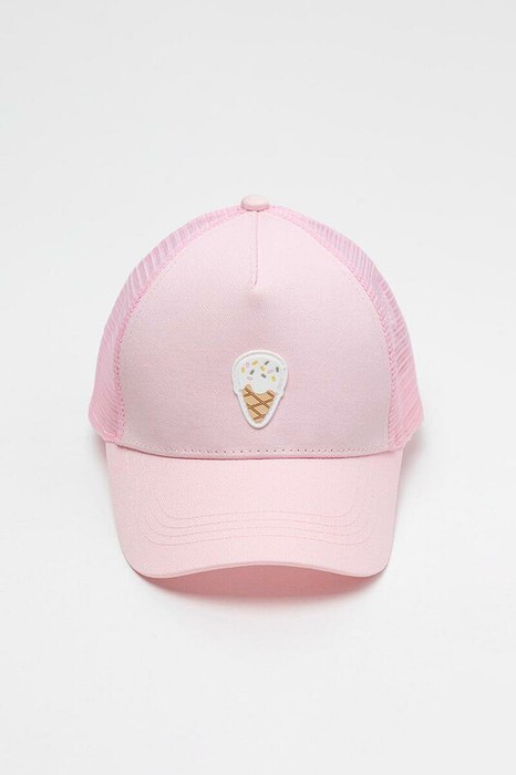 Кепка для девочки из текстиля и сетки. Спереди оригинальная нашивка. Регулируется по ширине и фиксируется на затылке с помощью пластиковой застежки.