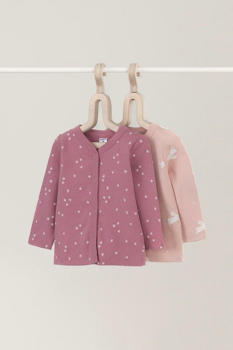Кофточки для новорождённых из мягкого эластичного трикотажа интерлок, произведённого из натурального хлопка. В упаковке 2 штуки. Застёгиваются спереди на кнопки. В размере 56 на рукавах предусмотрены отвороты, швы выполнены наружу. Оригинальная набивка выполнена из стойких гипоаллергенных текстильных красителей. Все трикотажные полотна производятся в соответствии с нормами Швейцарского сертификата ЭкоТекс.