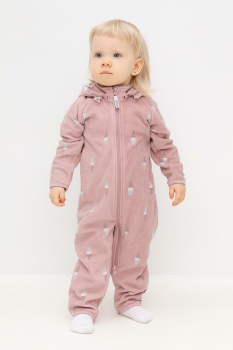 Флисовый комбинезон со съёмным капюшоном для девочки. У изделия высокий воротник и съёмный капюшон на кнопках с подкладом из супрема. Застёгивается на удлинённую молнию. Предусмотрена защита шеи и подбородка. В размерах 40/62 - 48/74 на рукавах и штанинах есть удобные отвороты. Оригинальная набивка выполнена из стойких, гипоаллергенных текстильных красителей. Комбинезон сохраняет цвет и форму после многократных стирок.